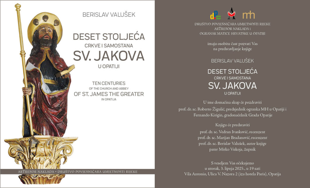 Zadovoljstvo nam je pozvati vas na predstavljanje knjige Deset stoljeća crkve i samostana sv. Jakova u Opatiji autora Berislava Valušeka koje će se održati u Opatiji 3. lipnja 2025.